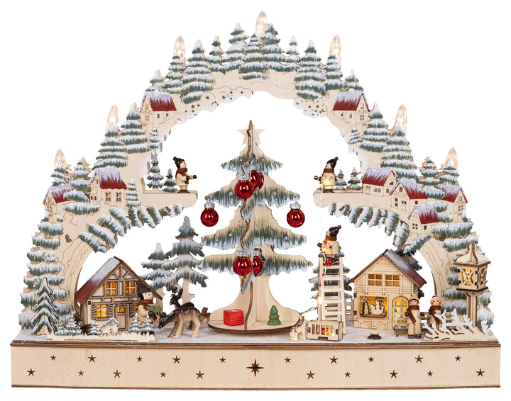 La maison de Noël en bois avec scène de Noël et cathédrale de la boutique de Noël De Smedt est sculptée dans du bois véritable puis peinte de différentes couleurs pour briller de jour comme de nuit. L'excellente finition fait ressortir chaque détail. Des petites fenêtres aux grands arbres et aux maisons décorées. De plus, l'éclairage LED offre une vue apaisante mais atmosphérique lorsqu'il fait sombre dans la maison.