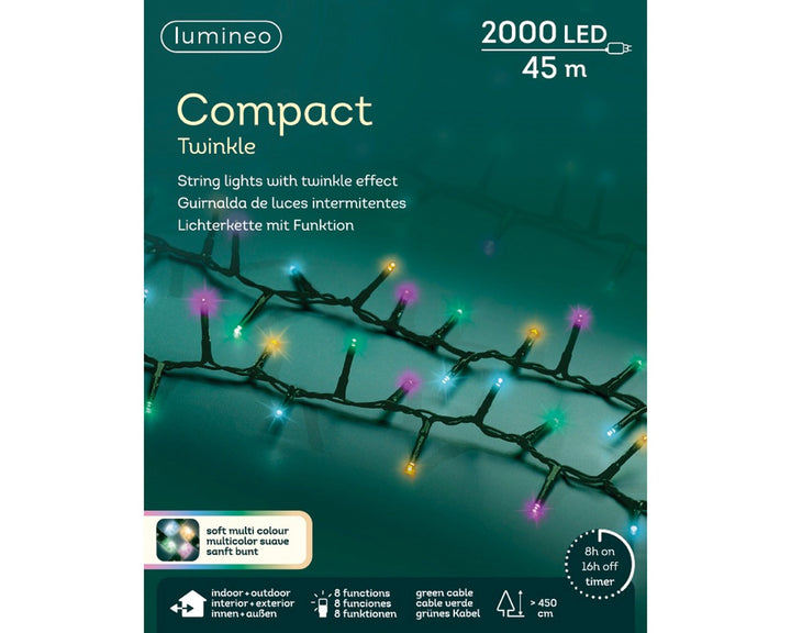 Deze Lumineo Kerstverlichting compact LED met soft multi kleur 45 meter - 2000 lampjes met twinkel effecten van kerstbomen De Smedt is de ideale kerstverlichting om zowel buiten en / of binnen te gebruiken.