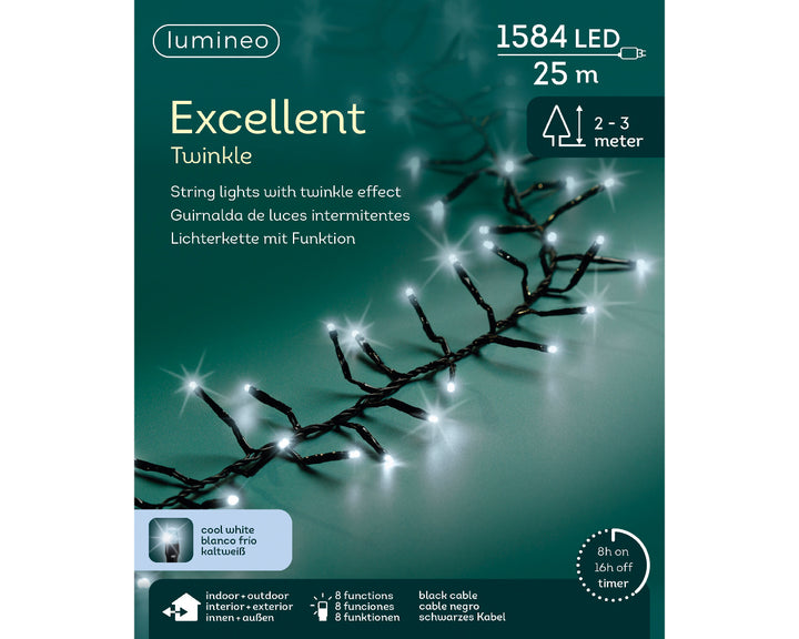 Deze Lumineo Kerstverlichting Excellent lights LED koel wit 25 meter - 1584 lampjes met twinkel effecten van kerstbomen De Smedt is de ideale kerstverlichting om zowel buiten en / of binnen te gebruiken.