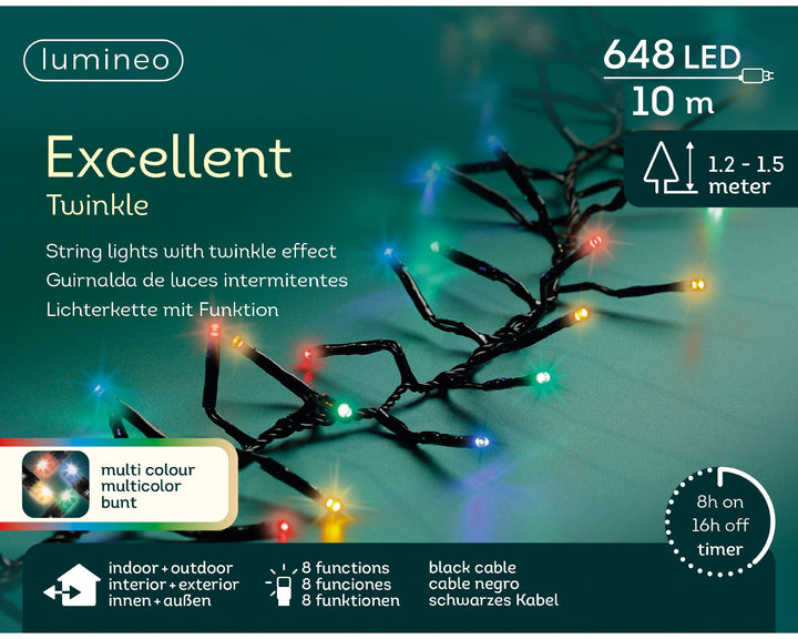 Deze Lumineo Kerstverlichting Excellent lights LED multi colour 10 meter - 648 lampjes met twinkel effecten van Kerstbomen De Smedt is de ideale kerstverlichting om zowel buiten en / of binnen te gebruiken.