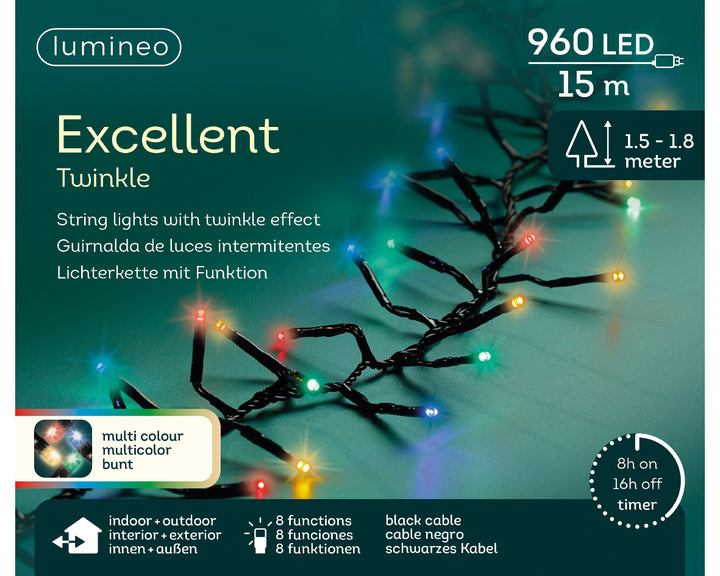 Deze Lumineo Kerstverlichting Excellent lights LED multi colour 15 meter - 960 lampjes met twinkel effecten van Kerstbomen De Smedt is de ideale kerstverlichting om zowel buiten en / of binnen te gebruiken.