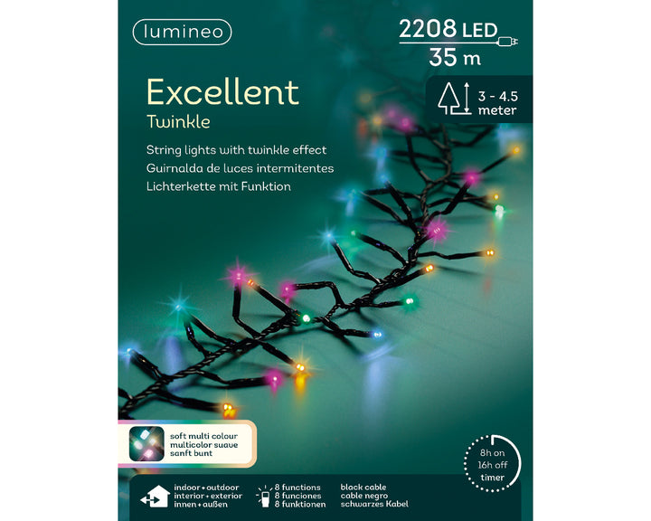 Deze Lumineo Kerstverlichting Excellent lights LED soft multi colour 35 meter - 2208 lampjes met twinkel effecten van Kerstbomen De Smedt is de ideale kerstverlichting om zowel buiten en / of binnen te gebruiken.