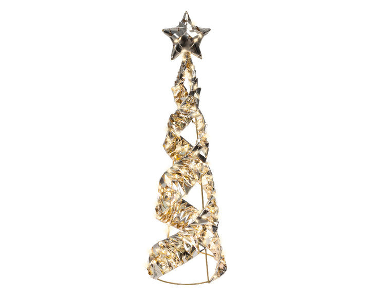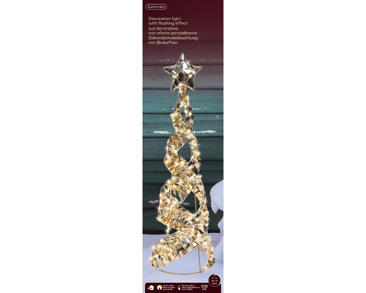 Outdoor verlichte kegel met goud polyester en warm witte verlichting van Kerstshop De Smedt is gemaakt van een zilveren metalen frame met hierrond goud reflecterend polyester gedraaid die de warm witte lichtjes zachtjes reflecteert. Dankzij het metalen frame kan je het makkelijk overal neerzetten en gaat het niet zomaar stuk. Daarnaast bevinden er zich maar liefst 300 LED lichtjes in de kegel, zodat deze een mooie lichtbron is in de tuin tijdens de lange nachten in de winter.